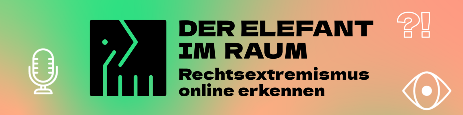 Der Elefant im Raum steht für ein offensichtliches Problem, das von vielen erkannt, aber nicht angesprochen wird. In den sozialen Medien gibt es viele Inhalte mit rechtsextremen Botschaften. Das Projekt Der Elefant im Raum versucht, für die Präsenz und Problematik dieser Inhalte zu sensibilisieren. In monatlichen Social Media-Kampagnen und Podcast-Folgen wird darüber informiert und werden rechtsextreme Ansprachen dekonstruiert.