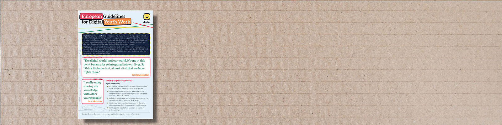 Die „Europäischen Leitlinien für digitale Jugendarbeit“ wurden entwickelt, um den Beitrag zur Stärkung junger Menschen in einer digitalisierten Gesellschaft dieser wichtigen Bildungspraxis herauszustellen. Das Papier enthält praktische und ethische Leitlinien für Jugendarbeiter*innen, Leitungskräfte in der Jugendarbeit und Organisationen. Als Prinzip ist in diesen Adressaten festgehalten, dass es sowohl auf der individuellen Ebene wie auch auf der Ebene der Organisationen gilt, gute Voraussetzungen für zielgruppengemäße und fachlich begründete Angebote zu schaffen. Dementsprechend enthalten die Leitlinien auch einen Handlungsaufruf an Fördereinrichtungen und politische Entscheidungsträger*innen.