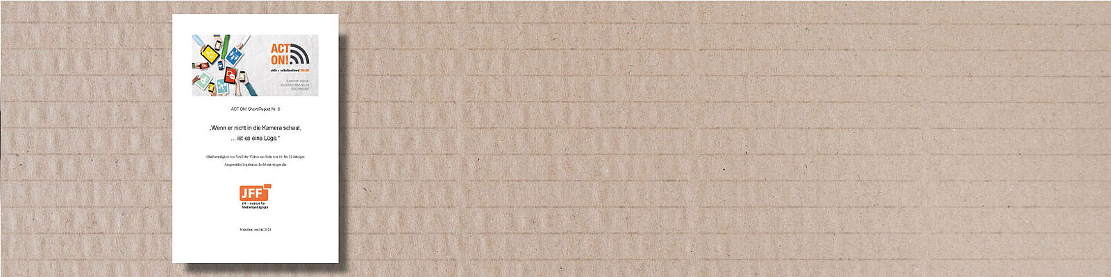 Der ACT ON! Short Report Nr. 6 „Wenn er nicht in die Kamera schaut, ... ist es eine Lüge.“ Glaubwürdigkeit von YouTube-Videos aus Sicht von 10-bis 12-Jährigen, behandelt die Perspektive von 10- bis 12-Jährigen auf die Glaubwürdigkeit von YouTube-Videos. Die Gruppeninterviews zeigen, dass etliche Befragte bestimmte Präsentationsarten, wie z. B. Produktplatzierungen stark hinterfragen. Insgesamt reichen ihre Einschätzungen von vollständigem Vertrauen in die Glaubwürdigkeit der Botschaften bis hin zu ausgesprochener Skepsis gegenüber allen Youtuber*innen. Zudem erklärten die 10- bis 12-Jährigen ihre Sicht auf weitere Risiken auf YouTube.