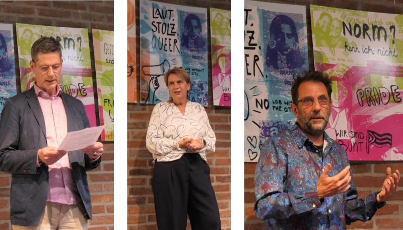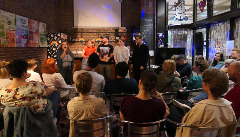 Den Auftakt machte am 16. Juli die queere Schreibwerkstatt mit Simone Bauer im HP8. Dort konnten mithilfe von Simones langjähriger Erfahrung, eigene Geschichten und queere Perspektiven zum Leben erweckt werden. Am Abend folgte im LeZ der queere Kurzfilmabend „Queer & kurzFILM!“ in Kooperation mit Queer*Yourope, der mit besonderen und eindrucksvollen Filmen junger Münchner Filmschaffenden und anschließendem Podiumsgespräch den Beginn des Festivals perfekt abrundete. Der zweite Tag markierte die feierliche Eröffnung des Festivals und die Vernissage der Posterreihe „Liebe(r) feiern“ im Pixel. Berührende Worte gab es von Kathrin Demmler, Dr. Arne Ackermann und Thomas Lechner zur Relevanz und Bedeutung von queerer Repräsentation und der Schaffung von Angeboten. Am Nachmittag bot der Elternabend „Mein Kind ist queer – was jetzt?“ für Eltern und Bezugspersonen die Möglichkeit, sich zu informieren und in Austausch zu treten, eingeladen und begleitet von den systemischen Beraterinnen und Familientherapeutinnen Tinne Neugebauer und Stefanie Ossenberg-Engels. Weiter gings abends in der Stadtbibliothek Bogenhausen, wo Anastasia Biefang im Gespräch mit Maximilian Pichlmeier über ihre Erfahrung als queere Person in der Bundeswehr sprach. Der dritte Tag startete kreativ mit dem Workshop „Graphic Novel Poster!“: Die Teilnehmenden konnten eigene visuelle Statements zu den Themen gestalten, die ihnen wichtig sind. Abends füllte sich das Pixel mit komödiantischer Heiterkeit beim „Queer Stand-Up Comedy“. Dr. Sabrina Mittermeier führte in einem kurzen Impulsvortrag in die Kunstform und Weiterentwicklung des Stand-Up Comedy ein, danach eroberten vier queere Comedians der Münchner Szene selbst die Bühne. Der letzte Tag rundete das Festival am 19. Juli mit zwei besonderen Workshops ab: Sportlich wurde es beim Box- und Selbstbehauptungsworkshop für FLINTA* mit Zeyneb Cakicioglu, wobei nicht nur körperliche, sondern gleichermaßen auch innere Stärke im Mittelpunkt stand. Zum Abschluss luden Anni und Katha vom Bildungsprojekt ace_arovolution abends im Pixel zum Diskutieren und Reflektieren über die Darstellung von Aromantik und Asexualität in den Medien ein.